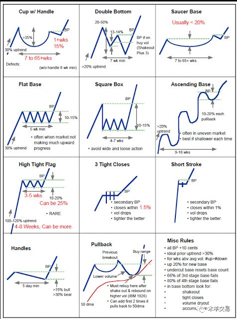 1股价必须在15天里上涨超过12天;2在这段时间里成交量至少要超过平均值的20%到25%3股价在15天里上涨超过20%常用交易形态:《常用形态详细解释》